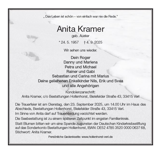 Ich bin froh das ich gestern bei dir auf die Trauerfeier war und könnte jetzt Abschied von dir nehmen. Unsere gemeinsame Frühstücke waren mehr als ein Ritual - sie waren Momente voller Lachen, Gespräche, Vertrautheit und echter Freundschaft. Ich werde dich vermissen so wie du warst......
