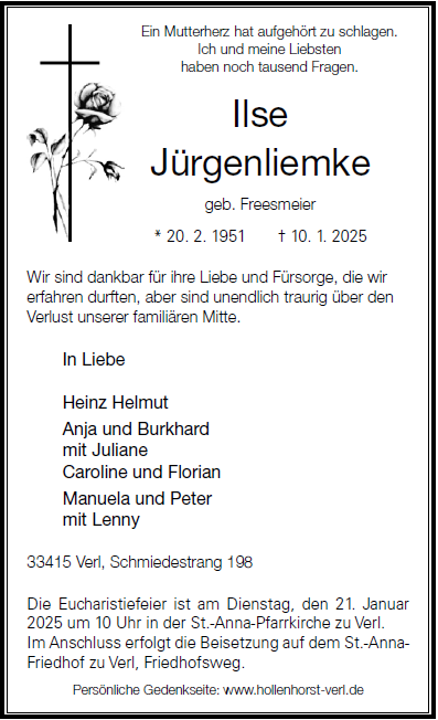 Leider mußte ich am heutige Tage, 20.01.2025, erfahren, das Du, liebe Ise, nicht mehr unter uns weilst...