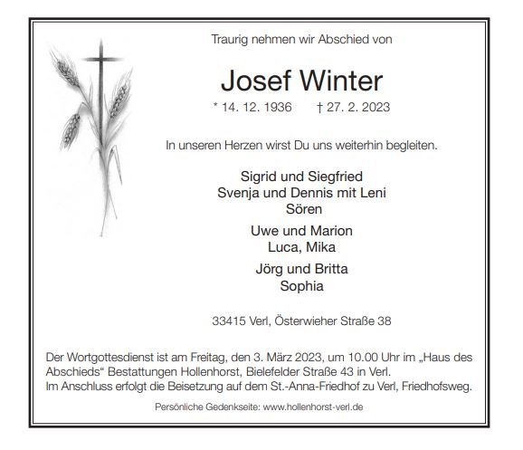 Als ich die Zeitung aufschlug und las, dass euer Vater, Schwiegervater und Opa verstorben ist, machte mich das sehr traurig. Zu diesem schmerzlichen Verlust spreche ich euch mein aufrichtiges Beileid aus.