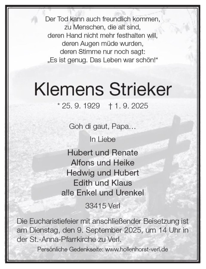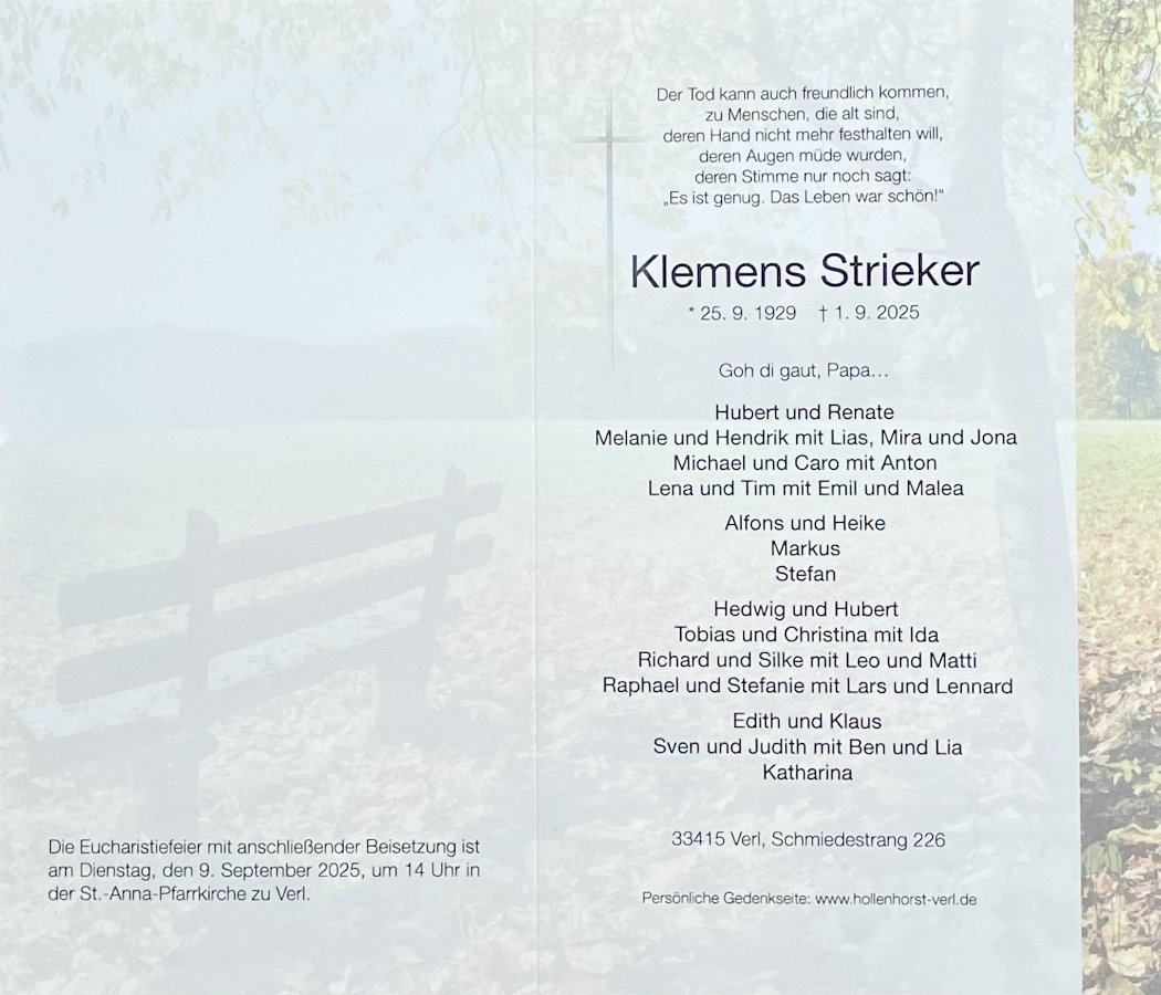 Als ich gelesen habe Klemens ist verstorben; musste ich daran denken viele Jahre haben Hartmut und Klemens bei Hollenhorst getragen und sich abwechselnd abgeholt. Euer Vater war immer ein freundlicher Mensch wenn wir uns mal getroffen haben hatten hatte er immer eine Lächeln und freundliches Wort. Nehmt diese Erinnerung als innige Verbundenheit Annette Kreuzer