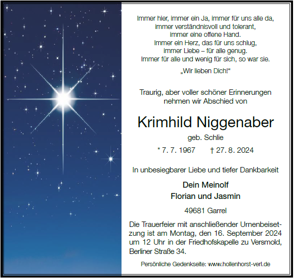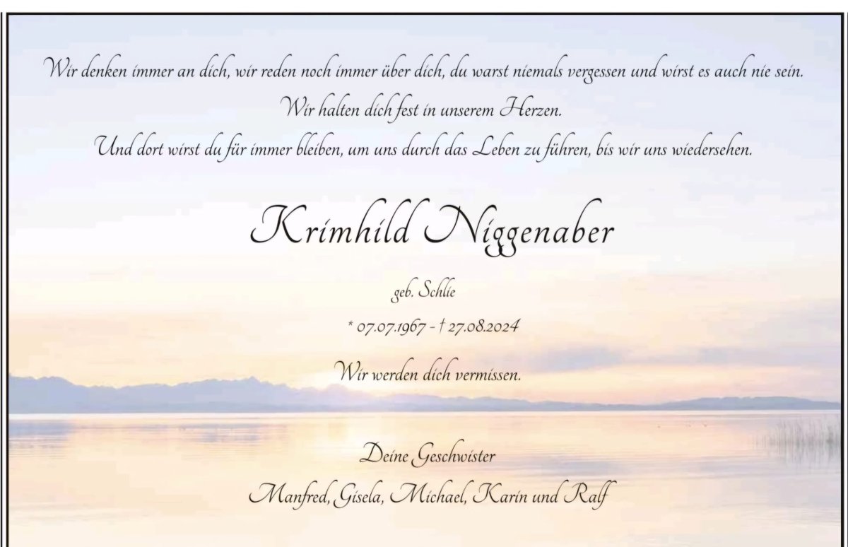 es ist nicht zu fassen, nicht zu glauben, unwirklich, und doch ist es die traurige Wahrheit, dass Krimhild nicht mehr unter uns ist. Wir sind tieftraurig. Über die ganzen Jahre, trotz der Entfernung, hatten wir immer wieder mal Kontakt gehalten. Ab und an haben wir es sogar geschafft uns wiederzusehen und es war sehr schön. Immer wieder haben wir uns vorgenommen uns wieder zu treffen. Die Jahre gingen ins Land...jetzt ist es zu spät.