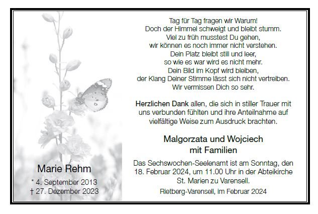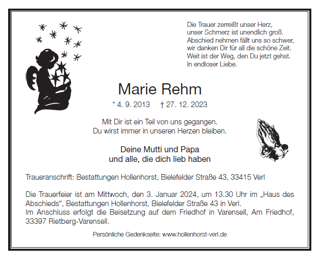 Ich habe erst jetzt davon erfahren und auch wenn es schon sehr lange her ist, dass ich Marie in der Grundschule betreute, so fühle ich mich doch so nahe bei Ihnen als wäre es gestern! Sie war immer fröhlich, zufrieden und erfrischte jedem den Tag. Ein Sonnenscheinchen. Mein tiefstes Mitgefühl!